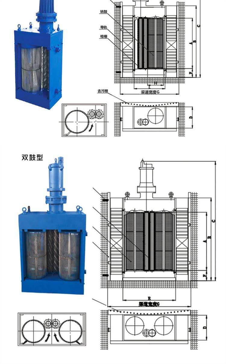 粉碎型格柵由干濕兩用防爆電機、變速箱、變速器、刀片、立式滾筒、密封、安裝支架、溢流格柵、潛水電纜、備用手動格柵等組成的粉碎格柵清洗機。電機啟動后,葉片和立式滾筒以不同的速度旋轉,污水進入滾筒區并送到切割區后,旋轉柵格截取污水中的固體浮物。采用差動旋轉的兩組葉片在軸向和徑向快速切割。它被粉碎成6~10 mm的小顆粒,大部分其他污水和足夠小的顆粒直接通過滾筒區域,破碎后的小顆粒隨著水泵的抽水而流動。